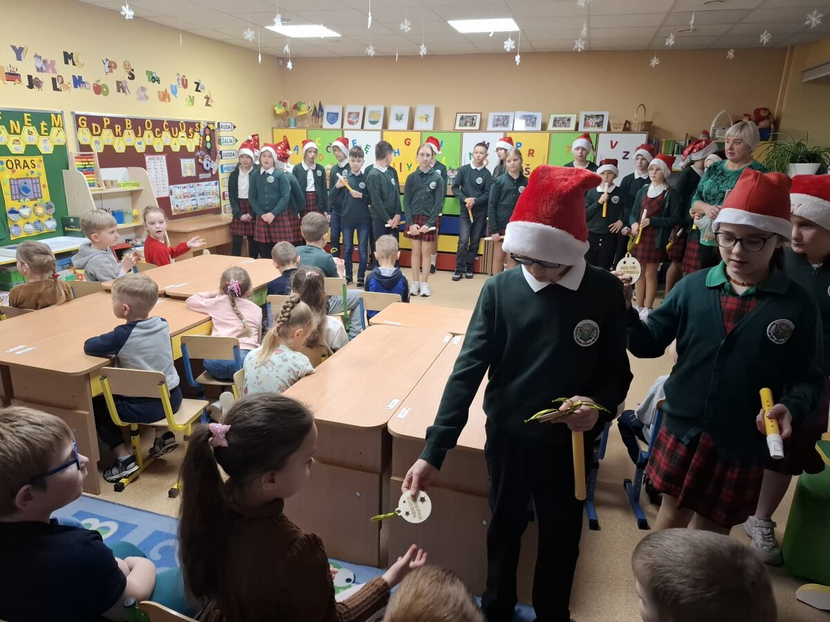 Adventas – ne tik susikaupimo, apmąstymų, bet ir gerų darbų įprasminimo metas. Šią savaitę mūsų progimnazijos ketvirtokai kartu su savo mokytojomis Rita Goleckiene, Rita Petkiene, Lina Baltrušaitiene artėjančių švenčių proga nepamiršo pasveikinti PUG vaikučių, kurie mokosi ne tik mūsų progimnazijos „Žiniukų“ ir „Bitučių“ grupėse, bet ir l/d „Liepaitė“ ir „Saulutė“. Koncerto metu ketvirtokai deklamavo nuostabias eilės, grojo dūdelėmis, dainavo daineles, o vėliau kiekvienam būsimam pirmokėliui padovanojo po kalėdinį žaisliuką. Vaikučiai labai džiaugėsi ir pažadėjo, kad parsinešę į namus pasikabins ant savo kalėdinės eglutės, kuris simbolizuos ir primins Raseinių Viktoro Petkaus progimnazijos šiltus ir glaudžius, nenutrūkstamus bendravimo ir bendradarbiavimo ryšius su ikimokyklinio ugdymo įstaigomis l/d „Liepaitė“ ir „Saulutė“. Visi ketvirtokai džiaugėsi patyrę teigiamas emocijas, nes kai kurie galėjo aplankyti net savo darželių grupes bei susitikti su auklėtojomis. Susitikimas baigėsi nuoširdžiais sveikinimais artėjančių šv. Kalėdų proga ir salėje bendrai sugiedota giesme „Džiaugsmingų šv. Kalėdų“.