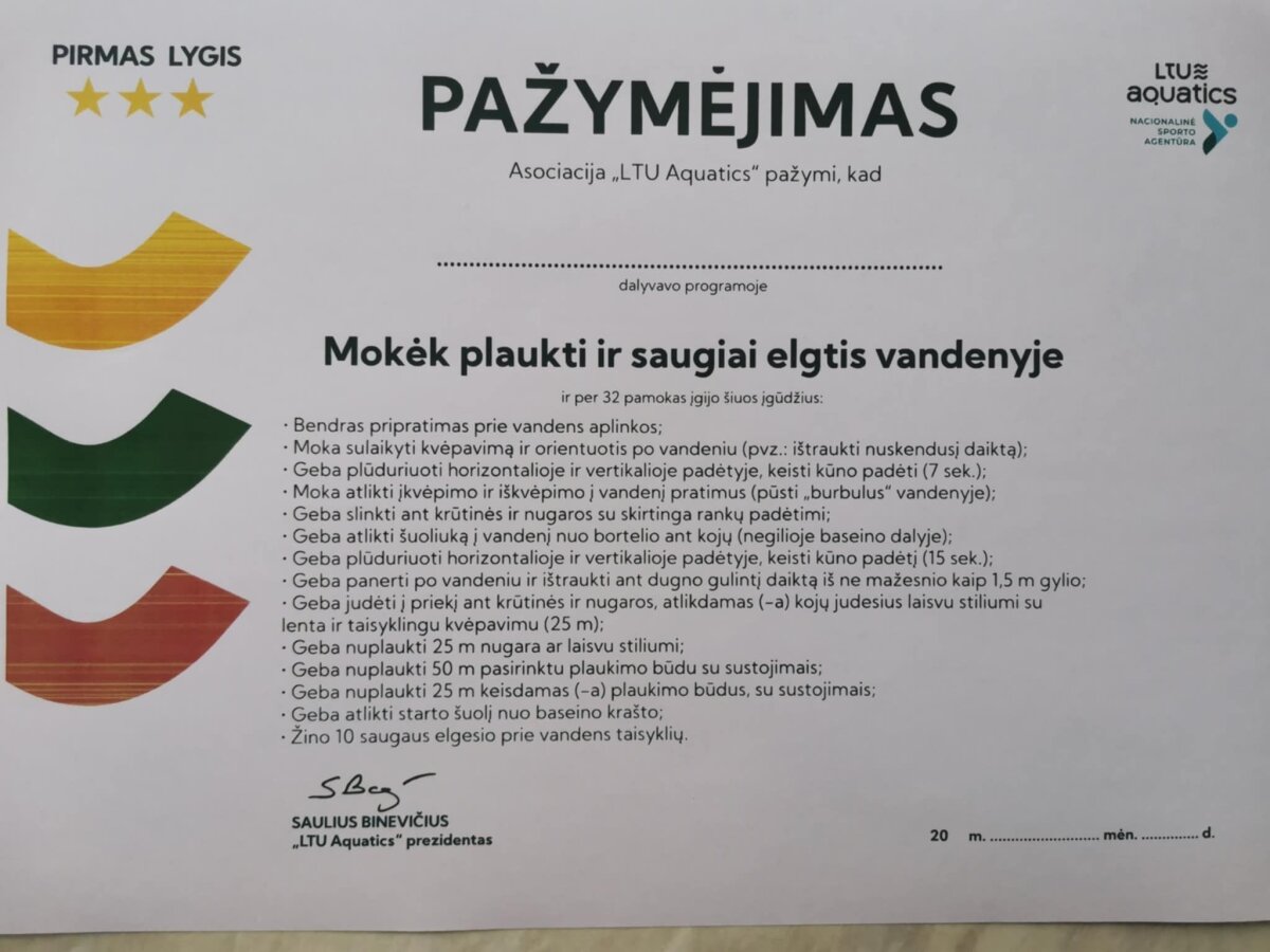 Mūsų antrokams 32 plaukimo pamokos vyko Kauno Žalgirio arenos baseine. Mokiniai labai sėkmingai baigė šią programą. Vaikai puikiai žino saugaus elgesio vandenyje taisykles, visi geba plūduriuoti, slinkti ant krūtinės ir nugara, beveik visi išmoko plaukti nugara, krauliu, atlikti starto šuolį nuo baseino krašto ir nugara. Treneriai pastebėjo ir ypač gabių mūsų vaikų, kuriems rekomendavo, esant galimybei, tęsti treniruotes. Baigus programą 41 antroko pasiekimai įvertinti I (aukščiausio) lygio, 11-os – II lygio ir 10 antrokų – III lygio diplomais. Su trenerių vertinimo rezultatais supažindinti mokinių tėvai (globėjai). Džiaugiamės rezultatais. Esam dėkingi už šią galimybę ir linkime sėkmės kitų mokslo metų antrokams.