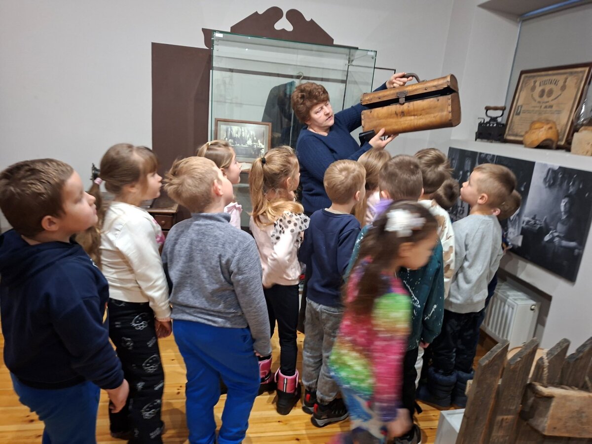 Priešmokyklinukai „Žiniukai“ nekantriai laukė savo pirmosios išvykos, spėliojo, kokia bus kelionė mokykliniu autobusu. Tik įėję į Raseinių krašto istorijos muziejaus vidų, vaikai iškart susidomėjo senoviniais daiktais, nuotraukomis ir pasakojimais apie mūsų krašto praeitį. Mažieji klausėsi  pasakojamų istorijų, uždavinėjo klausimus, stengėsi suprasti ir stebėjosi, kaip žmonės gyveno seniau. Su tradiciniais amatais ir verslais susipažino išbandę žaidimą–skulptūrinę kompoziciją „Malūnas“, taip pat noriai atliko sensorinį, interaktyvų žaidimą „Etnografijos lobynas“. Dalinosi patirtimi būdami kalviais, audėjomis, dailidėmis, bitininkais ir t.t.