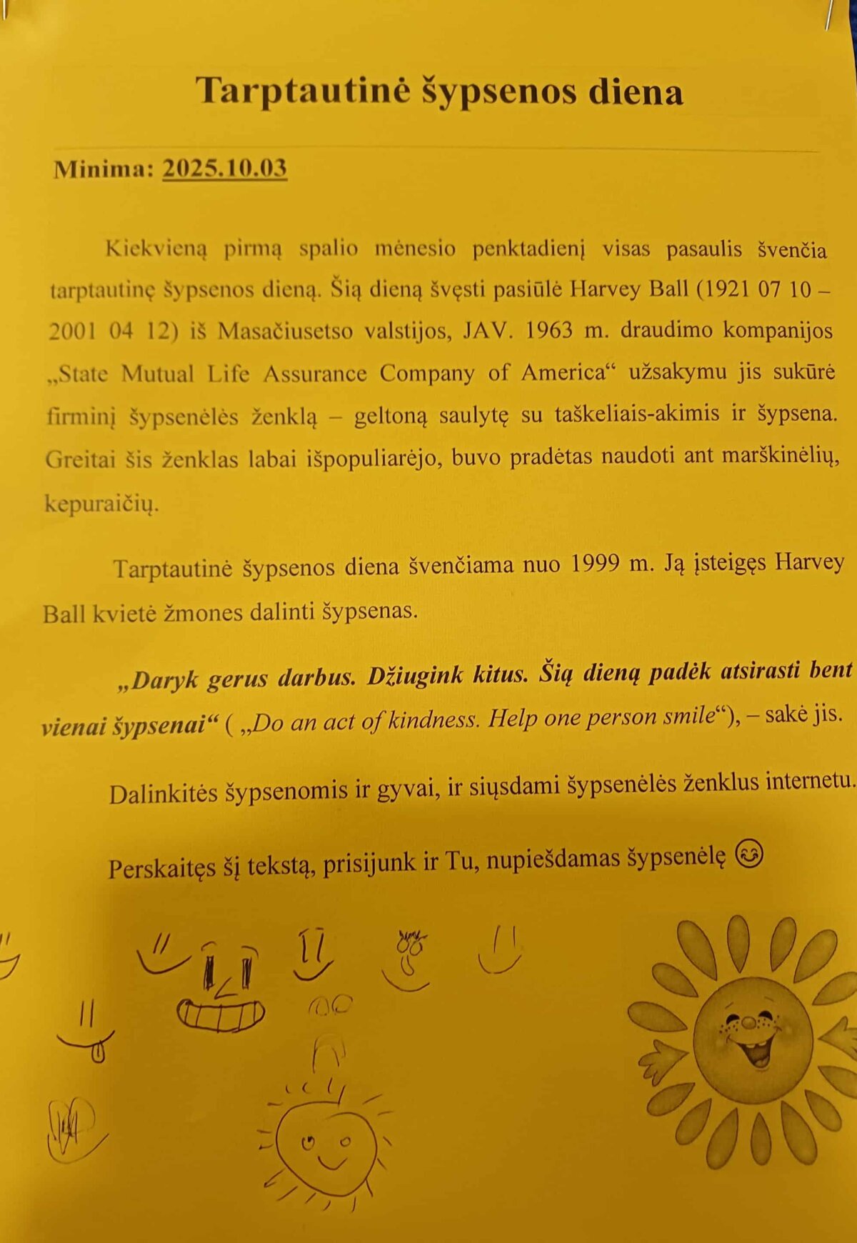 Spalio 4-ąją mūsų progimnazijoje paminėjome Pasaulinę šypsenos dieną. Šią smagią veiklą organizavo mokinių aktyvas, kviesdamas visus dalintis gera nuotaika ir gražiomis emocijomis. Mokyklos bendruomenės nariai, perskaitę informacinį tekstą apie šypsenos dienos prasmę, buvo kviečiami nupiešti šypsenas – taip skleisdami pozityvą ir primindami, kad šypsena nieko nekainuoja, tačiau gali padovanoti daug džiaugsmo kitiems. Dėkojame visiems, kurie įsitraukė į veiklą ir papuošė mūsų progimnaziją šypsenomis!