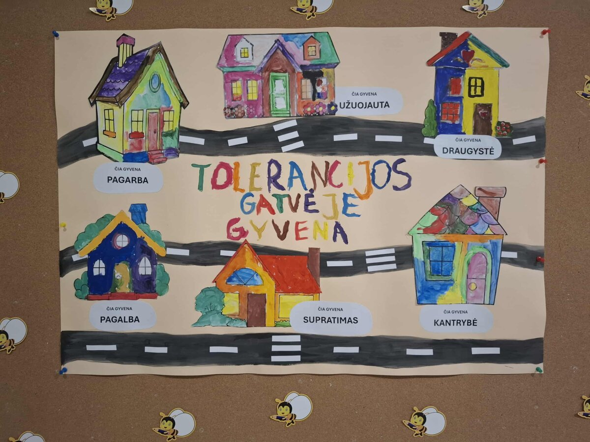 Džiaugiamės, kad patys mažiausieji progimnazijos ugdytiniai šiandien kalbėjo apie Gerumą, Draugystę, Mandagumą, Pagalbą – Toleranciją. Savo mintis ir supratimą išreiškė piešdami, maketuodami Tolerancijos gatveles, kurias gražino spalvingais nameliais. Kurdami Tolerancijos gatveles sprendė ir pakartojo įvairias situacijas apie saugumą, pagalbą, pagarbą, mūsų skirtumus ir panašumus. Kūrybinė akcija vyks ir kitą savaitę. Kviečiame visus progimnazijos mokinius aktyviai dalyvauti ir kurti savo Tolerancijos gatveles.