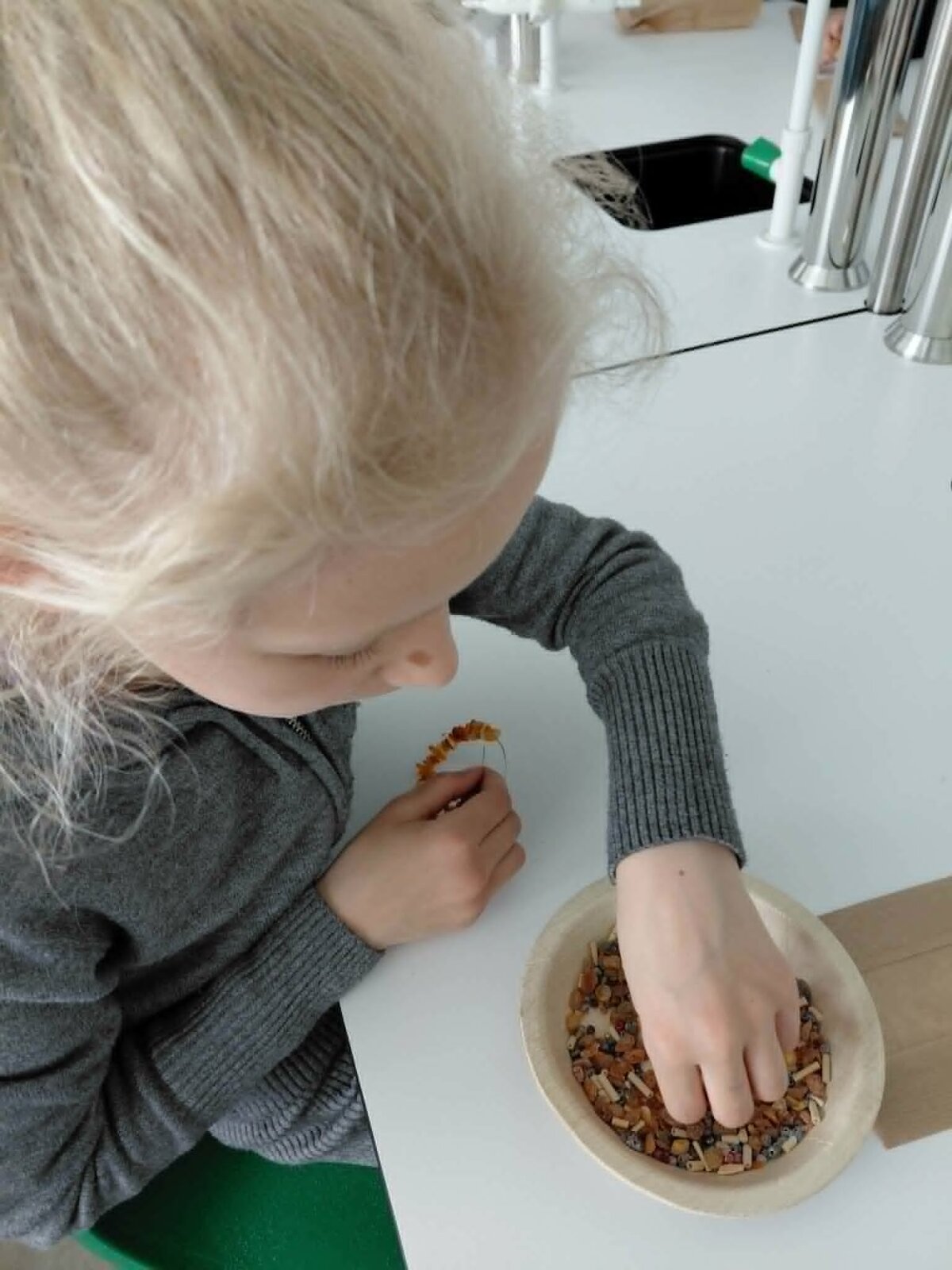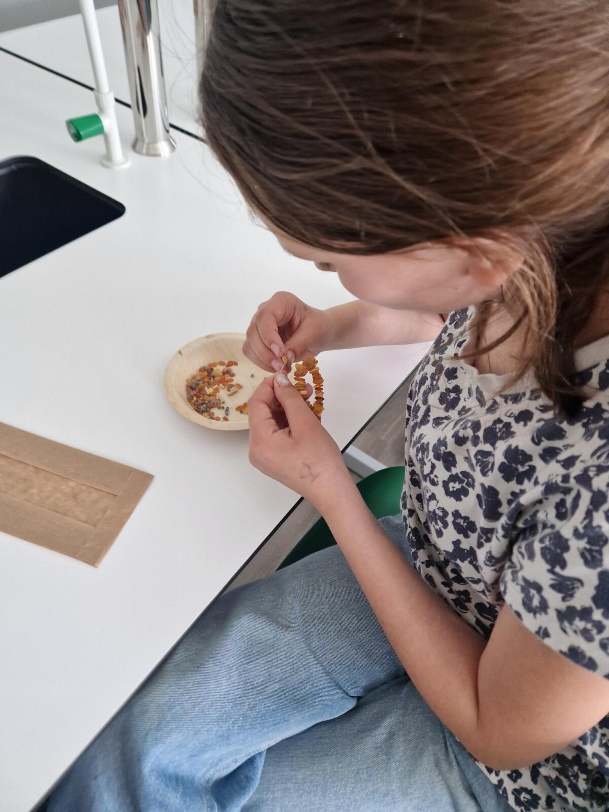 Kūrybinėje veiklos dalyje kiekvienas mokinys galėjo pasijusti juvelyru – atsirinkę tikro gintaro karoliukus, derino juos su kitomis medžiagomis ir kūrė unikalias apyrankes. Šioje veikloje vaikams talkino edukatorė Indrė.