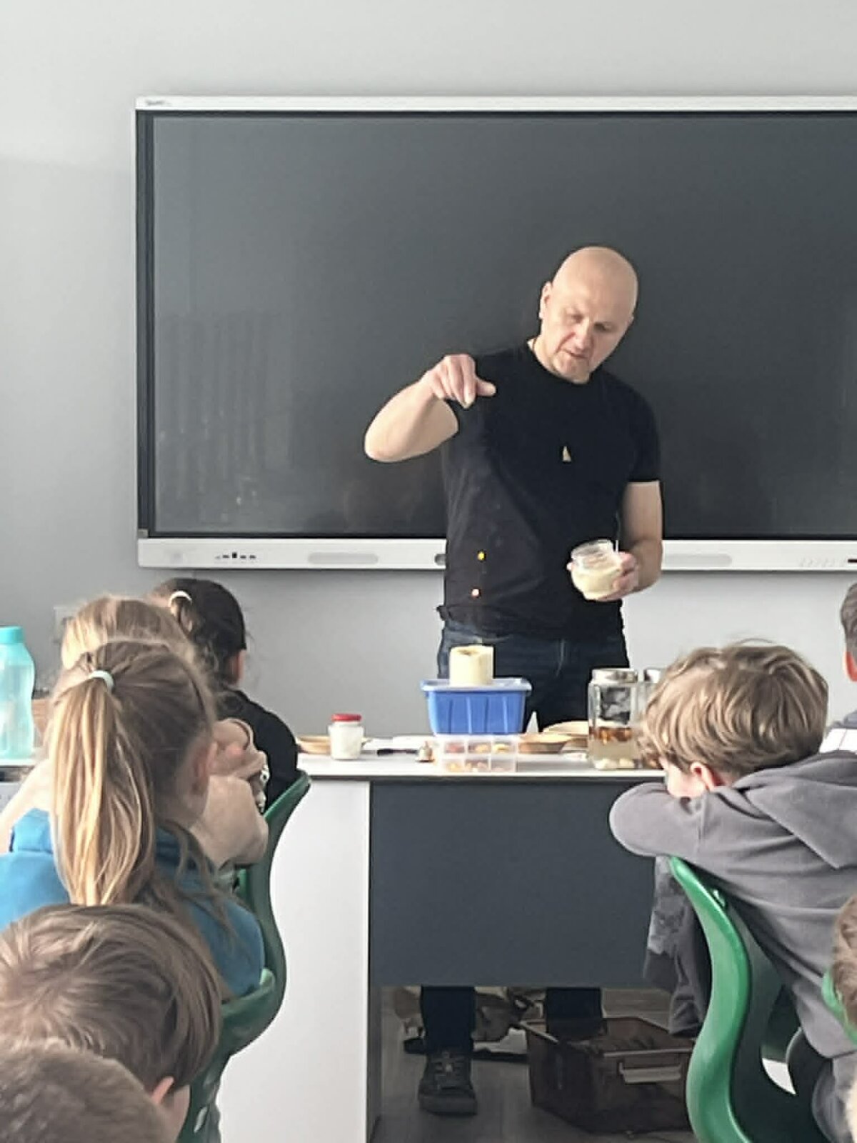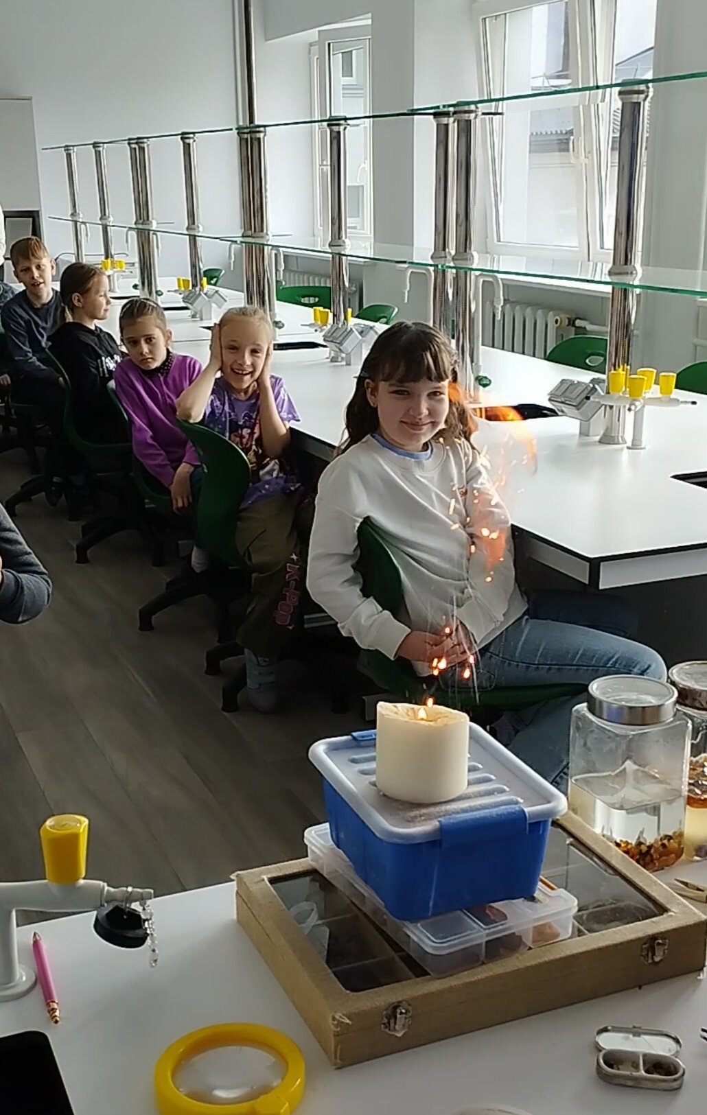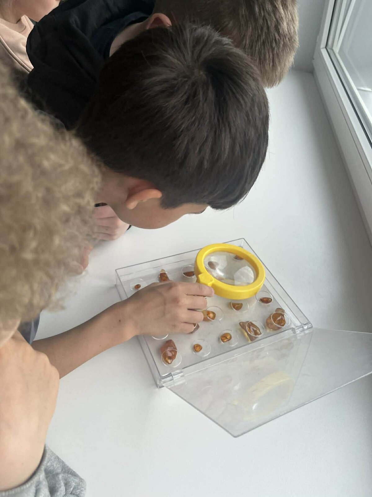 Charizmatiškasis edukatorius Robertas, pasitelkęs garsiąją legendą „Jūratė ir Kastytis“, įtaigiai papasakojo vaikams apie Baltijos gintaro atsiradimo istoriją. Mokiniai sužinojo, kaip susiformuoja gintaro gabalėliai, kaip juos atskirti nuo iš kitų medžiagų pagamintų karoliukų, tyrinėjo gintaro savybes, stebėjo jo reakciją į sūrų ir gėlą vandenį, susipažino su degumo ypatybėmis. Vaikai šildė gintaro dulkes delnuose, uodė jų skleidžiamą kvapą, o naudodamiesi didinamuoju stiklu apžiūrėjo gintaro inkliuzus.
