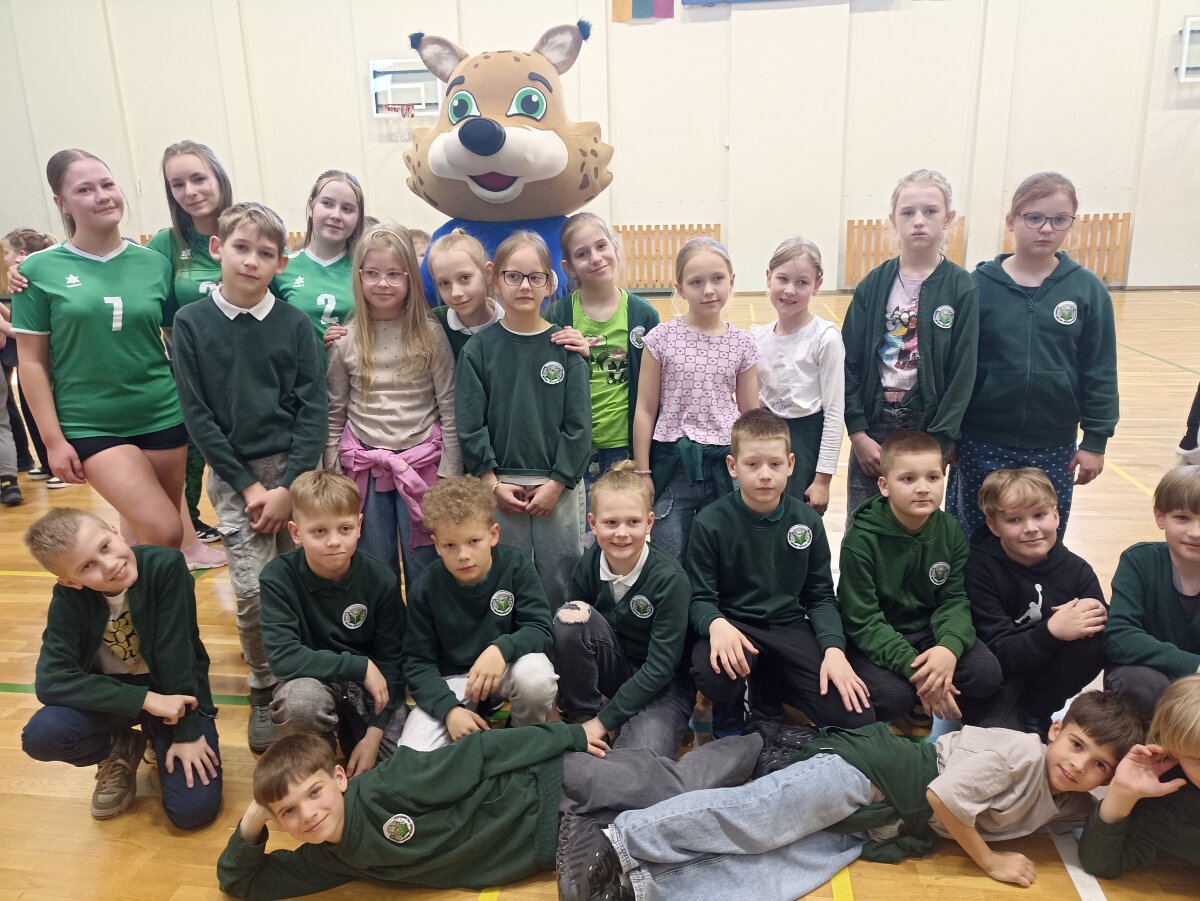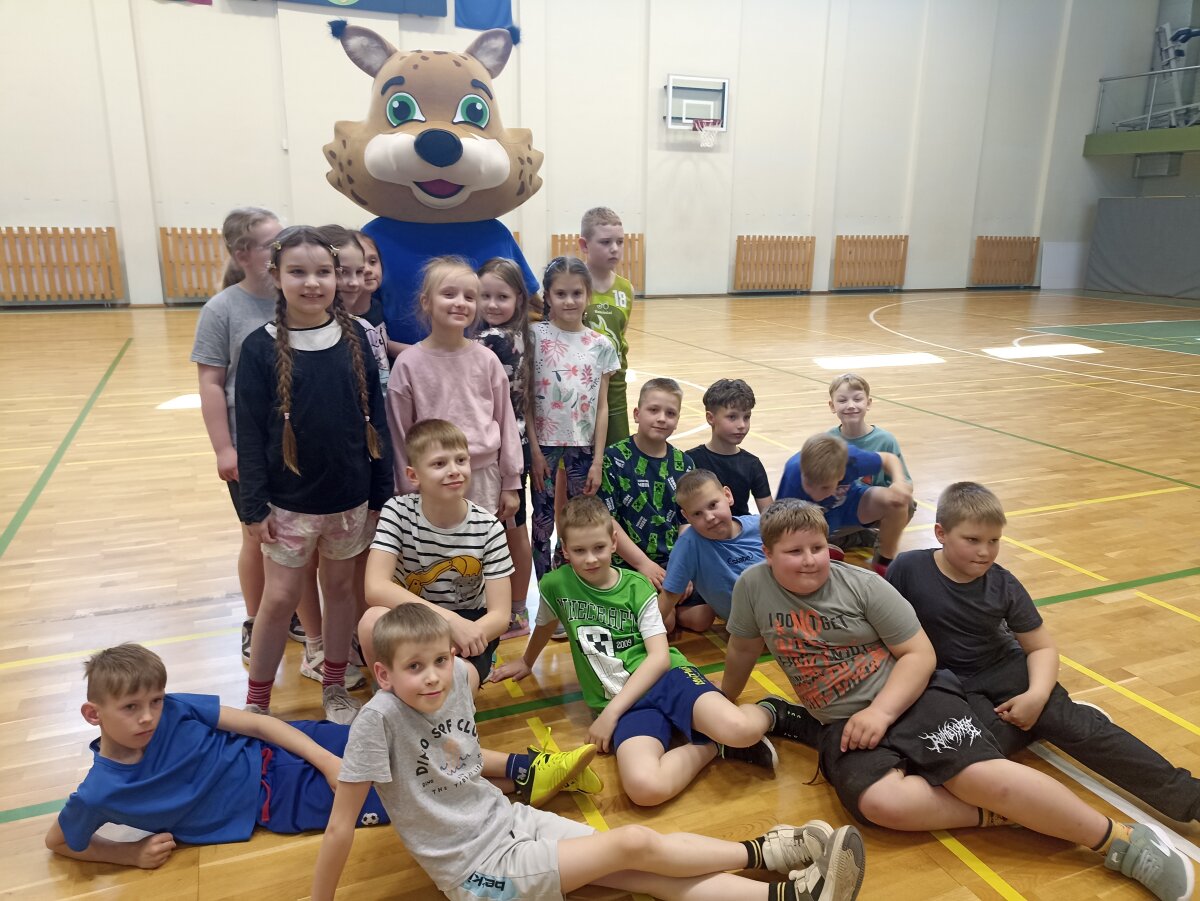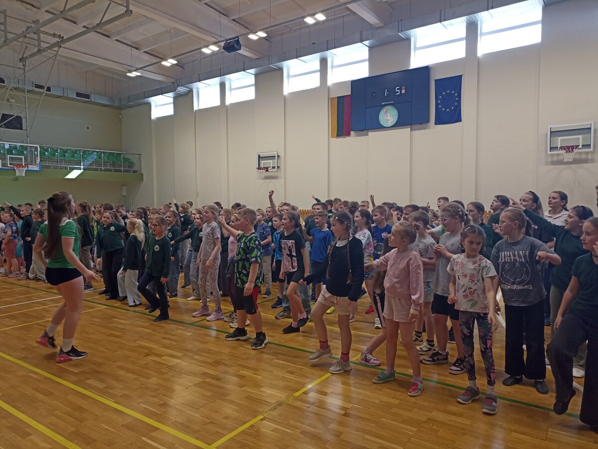 Vėliau Lūšiukas Sveikuoliukas skubėjo į didžiąją sporto salę. Čia kartu su 7b klasės mokinėmis pradinių klasių mokiniai šoko, mankštinosi, patyrė daug teigiamų emocijų ir džiaugėsi aktyvaus judėjimo nauda.