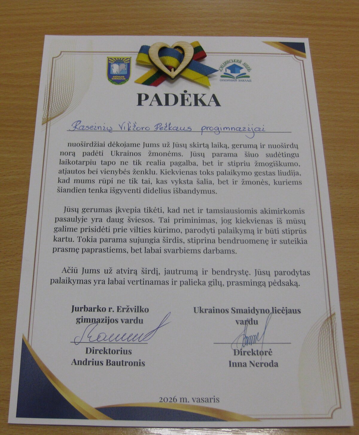 Mūsų progimnazijos bendruomenė neabejinga kitų skausmui. Ji ne tik dalyvavo pilietinėje iniciatyvoje ir kartu su Jurbarko r. Eržvilko gimnazijos bendruomene gamino Apkasų žvakes, tačiau, tęsiantis Rusijos karui prieš Ukrainą, prisidėjo prie humanitarinės pagalbos ir nupirko generatorių, kuris skirtas Žmerynkos rajono, Vinycios srities, Ukrainos Smaidyno licėjaus bendruomenei. Džiaugiamės galėdami padėti tiems, kuriems „šiandien tenka išgyventi didelius išbandymus“.