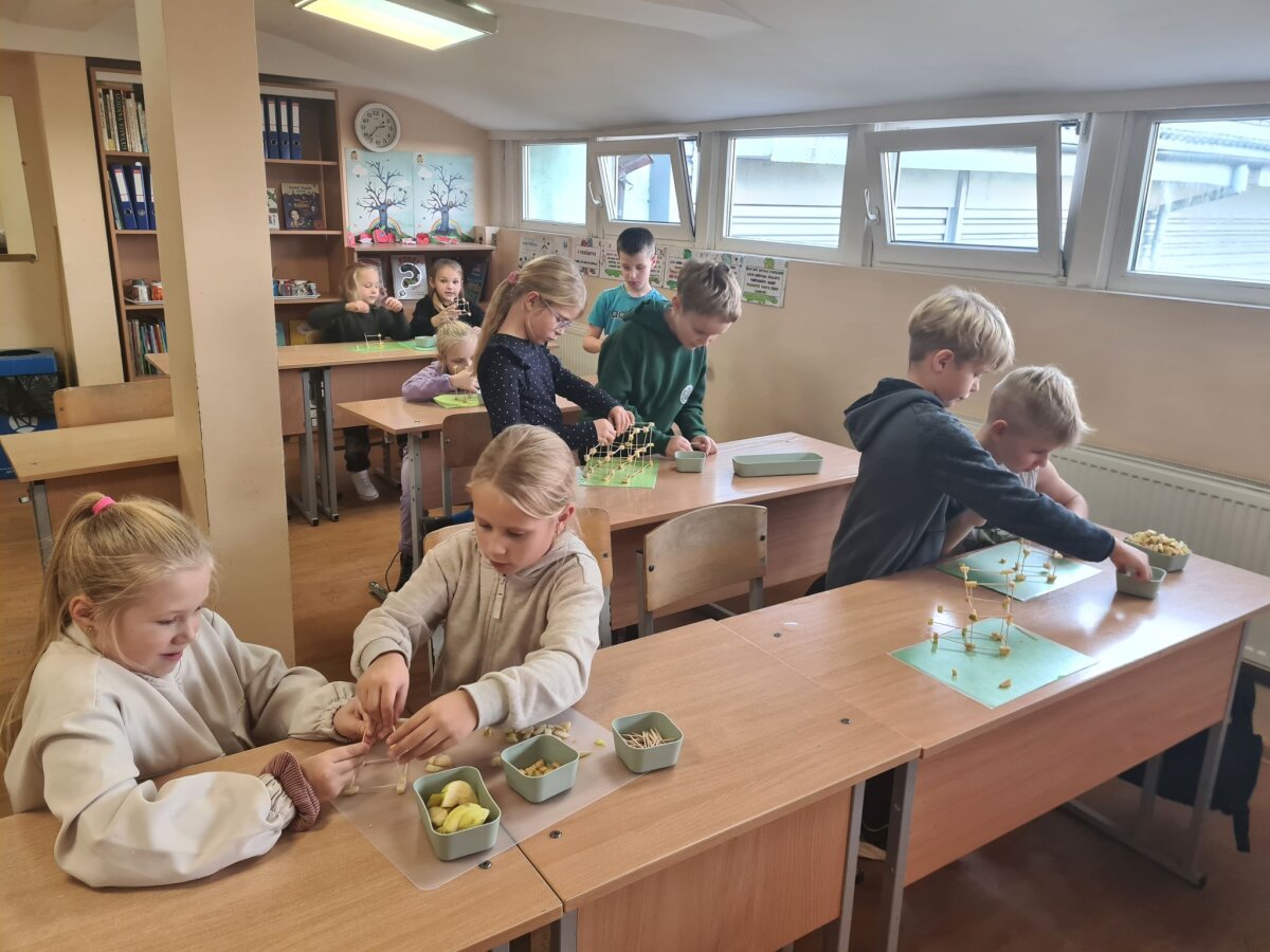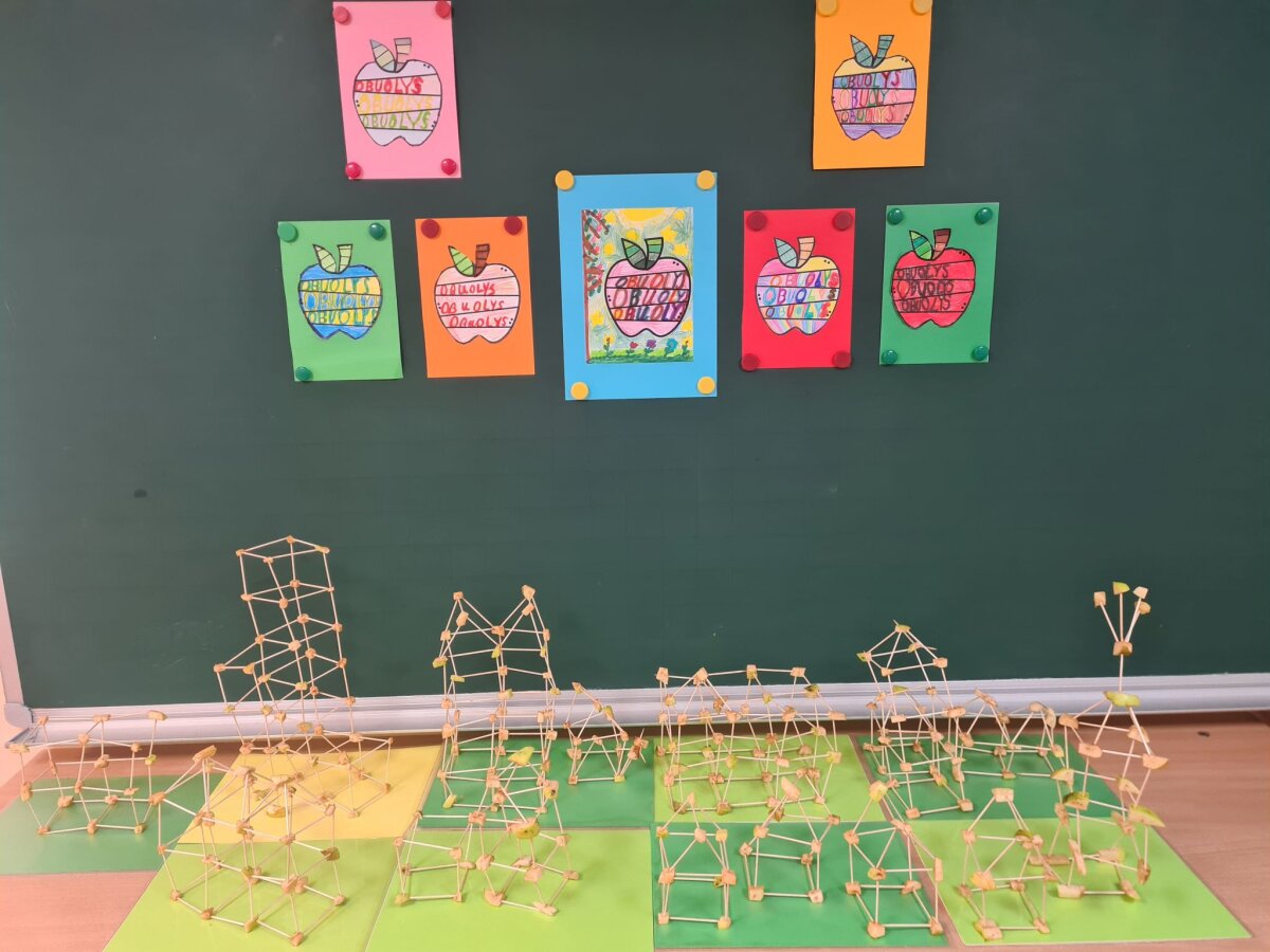 Kūrybinių dirbtuvių metu iš obuolių, popieriaus ir kitų priemonių gimė įvairūs darbai. Didelio susidomėjimo sulaukė STEAM veikla, kai mokiniai pjaustė obuolius kubeliais, o šiuos jungdami dantų krapštukais kūrė statinius – bokštus, tiltus, namelius. Vaikai džiaugėsi, kad iš paprasto vaisiaus galima sukurti tiek įdomių formų ir konstrukcijų, o kartu lavino kūrybiškumą, kruopštumą bei inžinerinius gebėjimus.
